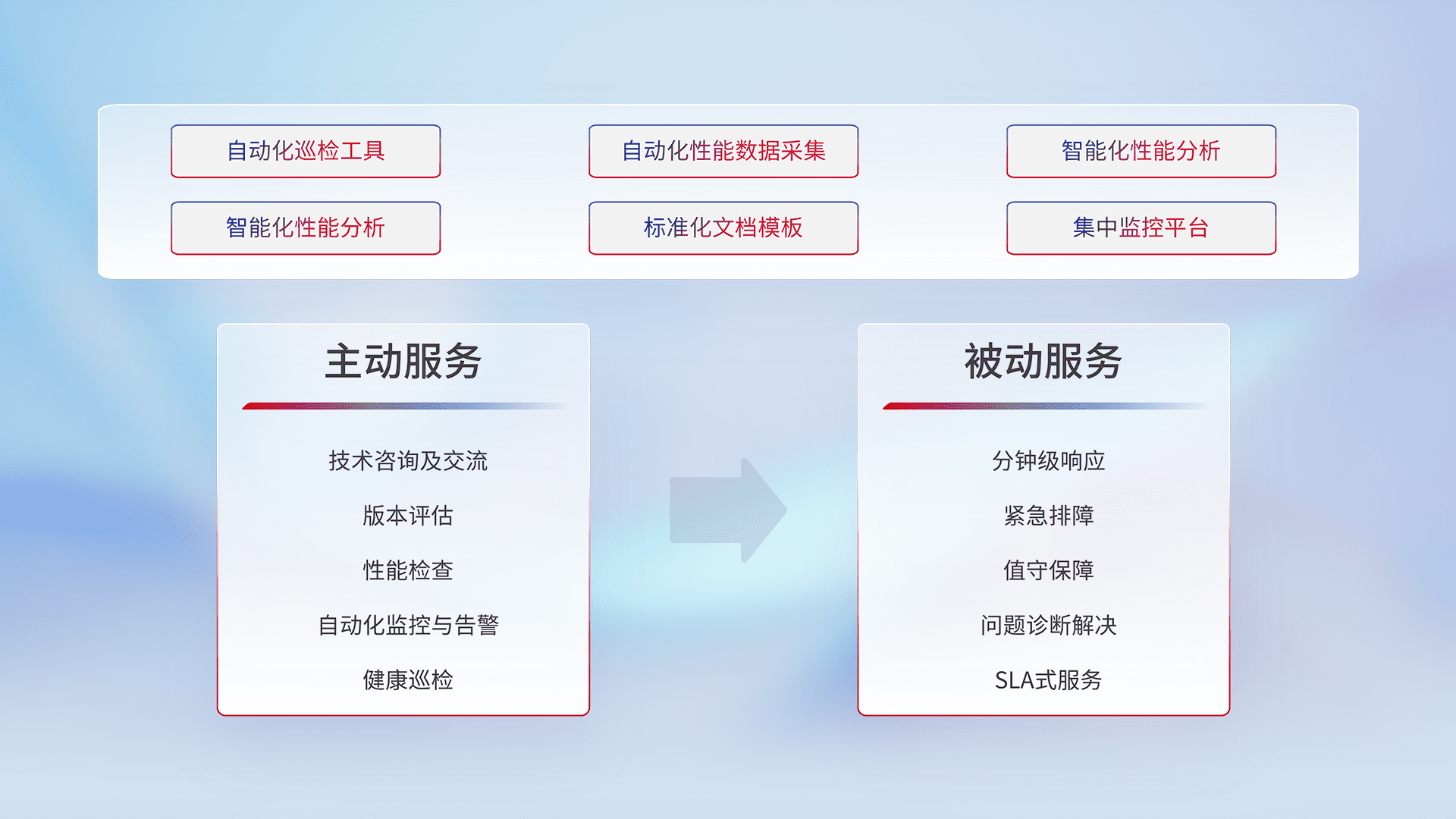 智能化工具和标准化文档,,,保障服务质量,,提供主动服务(包含技术咨询、、、、版本评估、、、性能检查、、自动化监控与告警、、、、健康巡检)和被动服务包含(分钟级响应、、、紧急排障、、、、值守保障、、、、问题诊断解决、、、SLA服务)。。。